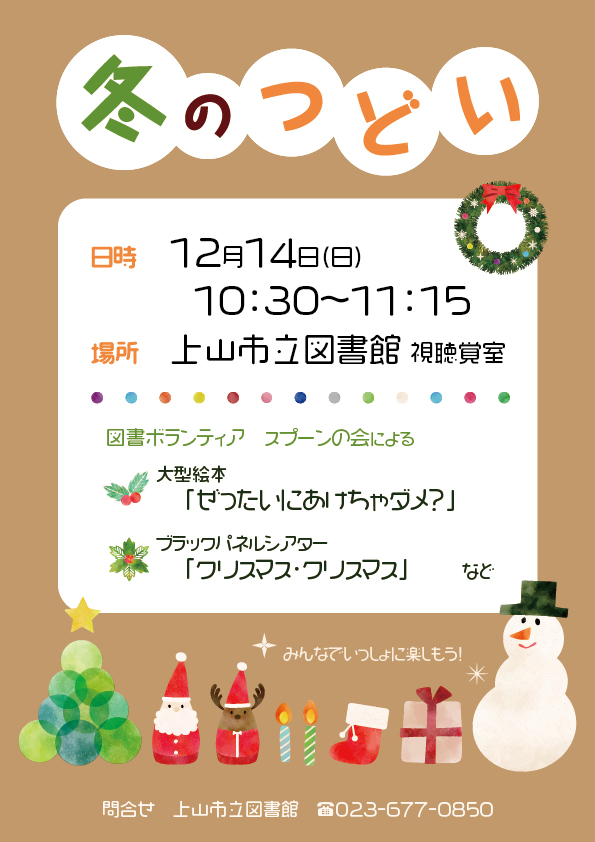 日 時 12月14日(日) 10:30〜11:15 場 所 上山市立図書館 視聴覚室 内 容 図書ボランティア「スプーンの会」による大型絵本のよみきかせ、ブラックパネルシアター、手遊びなど。