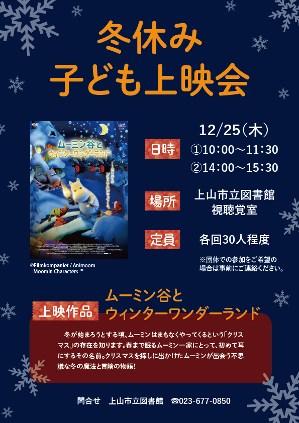日 時 12月25日(木)@10:00〜11:30A14:00〜15:30 場 所 上山市立図書館 視聴覚室 定 員 各回30人程度 ※団体での参加をご希望の場合は事前にご連絡ください。 上映作品 『ムーミン谷とウィンターワンダーランド』