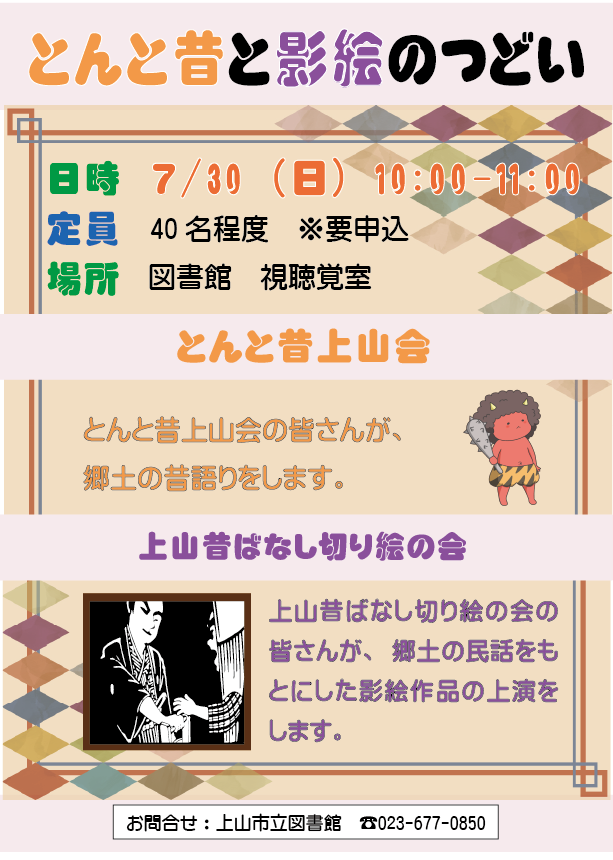 日 時 7月30日(日) 10:00〜11:00 場 所 上山市立図書館 視聴覚室 定 員 40名程度(※要申込) 内 容 とんと昔上山会の皆さんによる郷土の昔語りと上山昔ばなし切り絵の会の皆さんが、郷土の民話をもとにした影絵作品の上演をします。