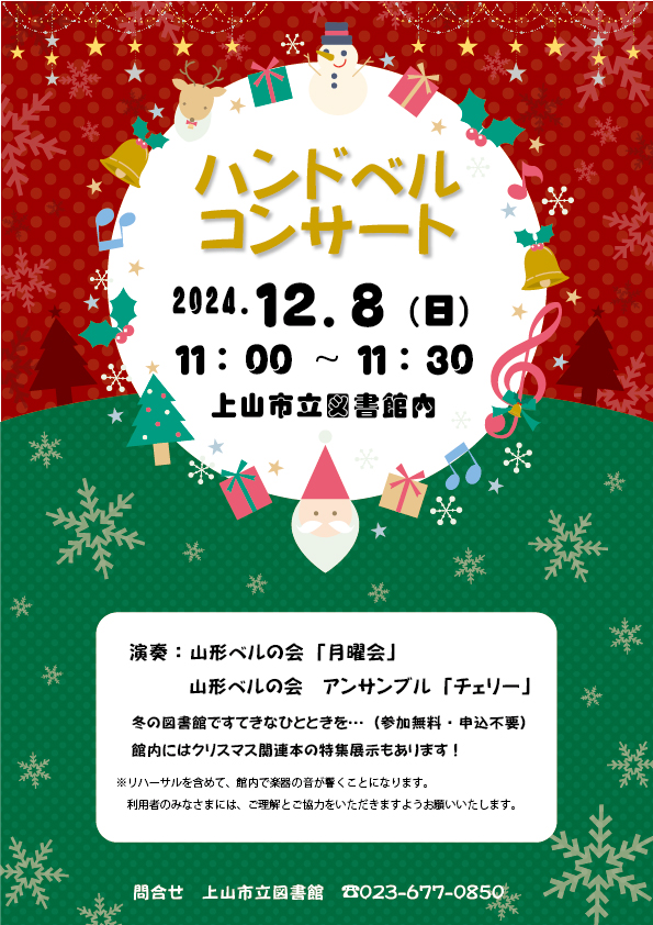 日 時 12月8日(日) 11:00〜11:30 場 所 上山市立図書館内 演 奏 山形ベルの会「月曜会」、山形ベルの会アンサンブル「チェリー」 ※リハーサルを含めて、館内で楽器の音が響くことになります。利用者のみなさまには、ご理解とご協力をいただきますようお願いいたします。