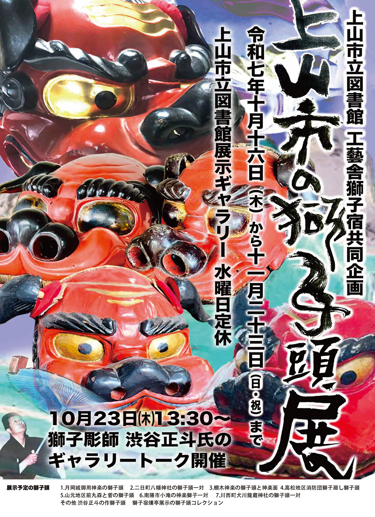 日 時 2025年10月16日(木)〜11月23日(日・祝) 場 所 上山市立図書館 展示コーナー 関連イベント「ギャラリートーク」(申込不要・無料) 獅子彫師・渋谷正斗さんによる展示品解説。 日 時 10月23日(木)13:30〜11:30 場 所 上山市立図書館 展示コーナー前