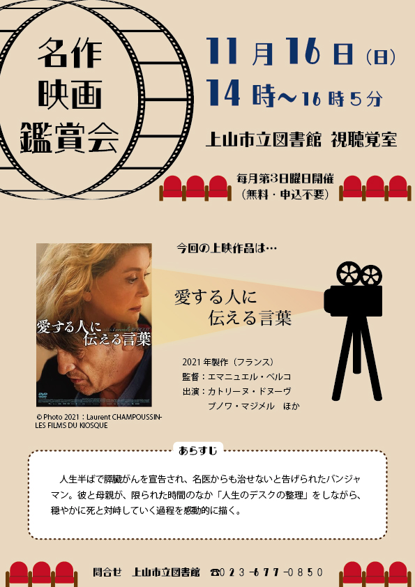 日 時 2025年11月16日(日) 14:00~16:05 場 所 上山市立図書館 視聴覚室(申込不要・無料) 上映作品 『愛する人に伝える言葉』 ※今年度の上映スケジュールは【こちら】から。