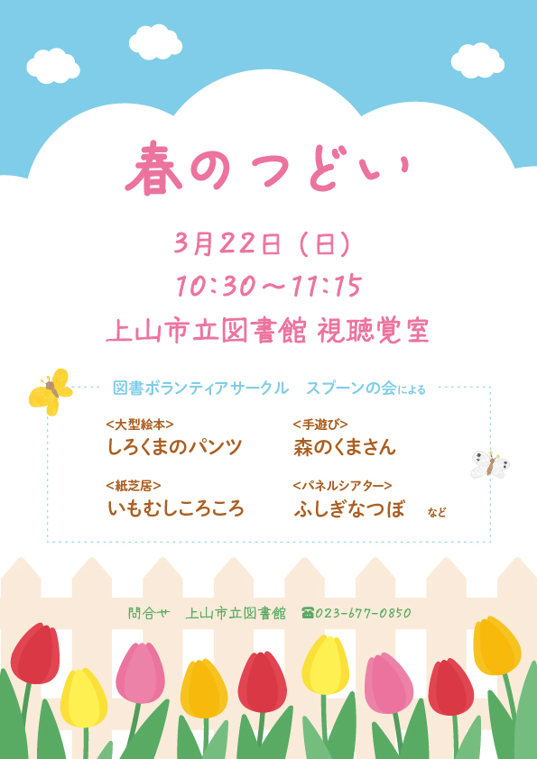 日 時 2026年3月22日(日) 10:30〜11:15 場 所 上山市立図書館 視聴覚室 ボランティアサークル「スプーンの会」による、大型絵本のよみきかせやパネルシアターなど。 みんなで一緒に楽しもう♪