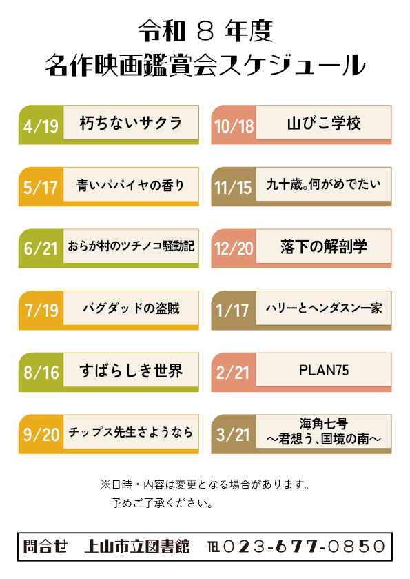 毎月第3日曜日午後2時から、上山市立図書館視聴覚室にて、無料・申込み不要です。