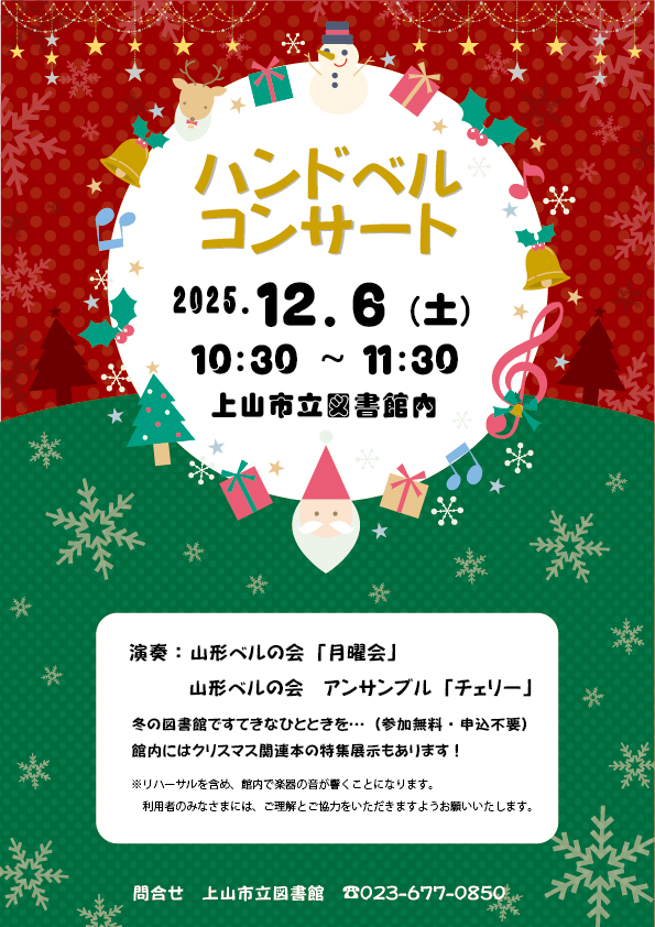日 時 12月6日(土) 10:30〜11:30 場 所 上山市立図書館内 演 奏 山形ベルの会「月曜会」、山形ベルの会アンサンブル「チェリー」 ※リハーサルを含めて、館内で楽器の音が響くことになります。利用者のみなさまには、ご理解とご協力をいただきますようお願いいたします。