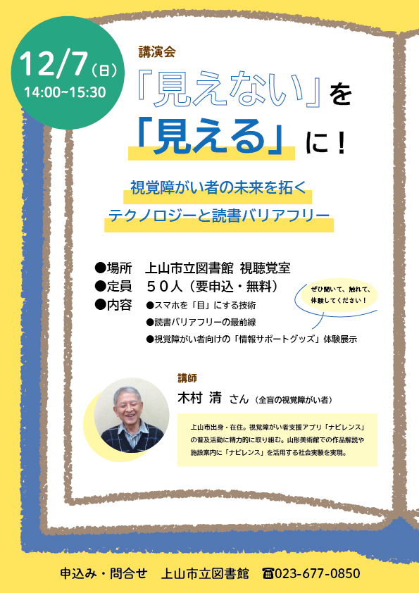 上山市出身・在住。視覚障がい者支援アプリ「ナビレンス」の普及活動に精力的に取り組む。山形美術館での作品解説や施設案内に「ナビレンス」を活用する社会実験を実現。