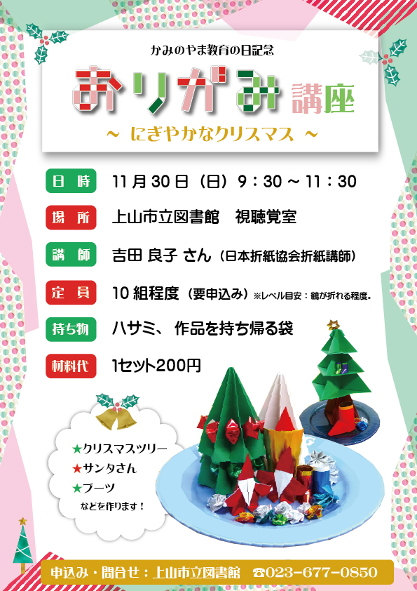 日 時 11月30日(日) 9:30〜11:30 内 容 クリスマスツリーやサンタさん、ブーツなどを作ります。 ※レベル目安:鶴が折れる程度。 場 所 上山市立図書館 視聴覚室 講 師 吉田良子さん(日本折紙協会折紙講師) 定 員 10組程度(要申込み) 材料代 1セット200円 持ち物 ハサミ、作品を持ち帰る袋