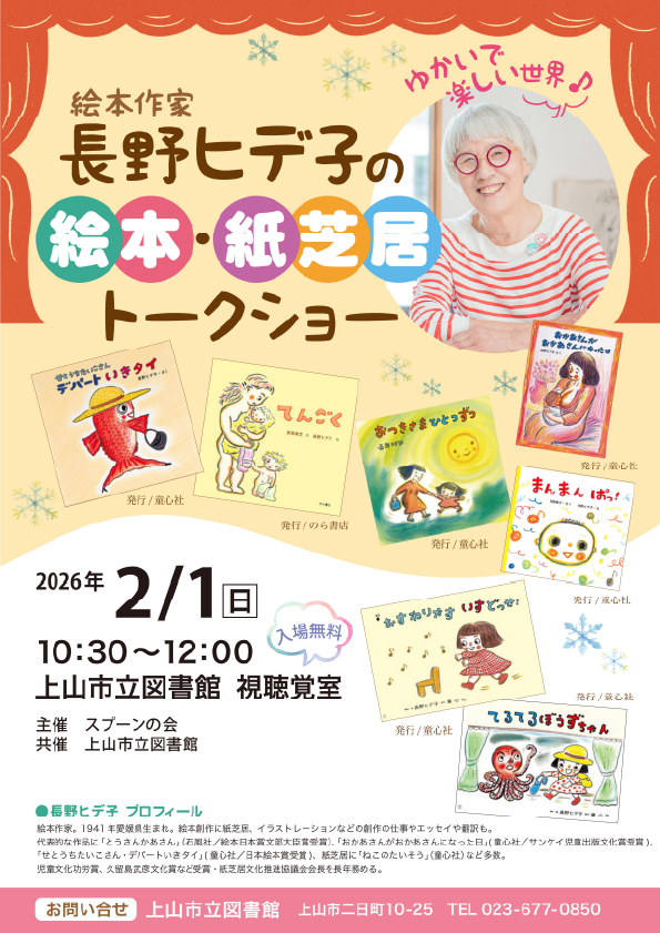 日 時 2026年2月1日(日) 10:30〜12:00 場 所 上山市立図書館 視聴覚室 ※入場無料・申込不要。 絵本・紙芝居作家の長野ヒデ子さんがやって来る!
