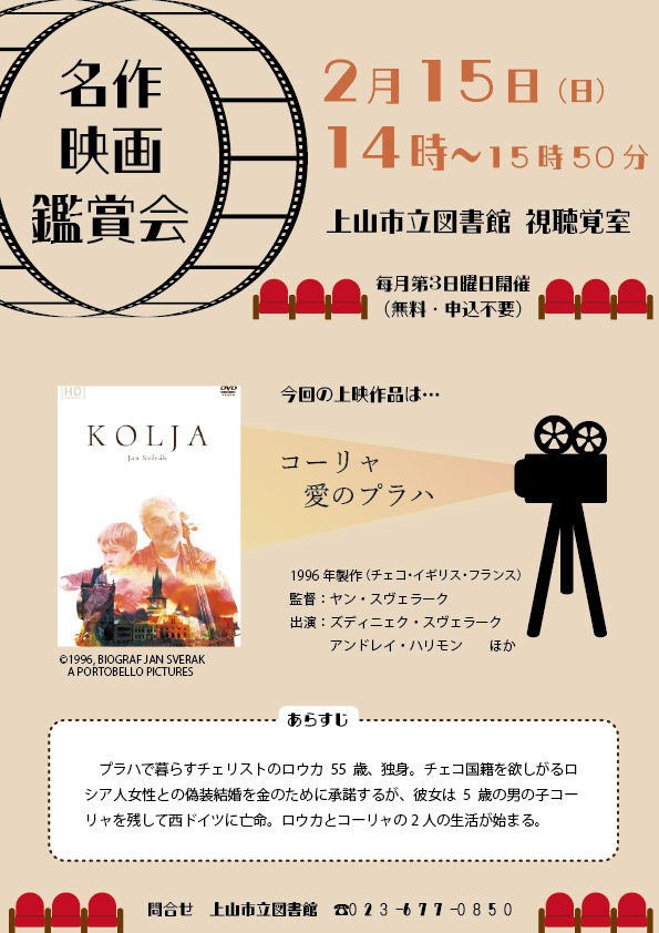 日 時 2026年2月15日(日) 14:00~15:50 場 所 上山市立図書館 視聴覚室(申込不要・無料) 上映作品 『コーリャ 愛のプラハ』 ※今年度の上映スケジュールは【こちら】から。